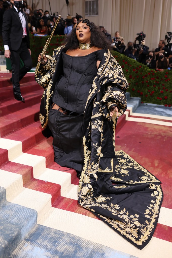 Lizzo wears a black and gold ensemble to the 2022 Met Gala. She compliments the look with her iconic flute. New York City, NY. May 2, 2022. (Getty Images)