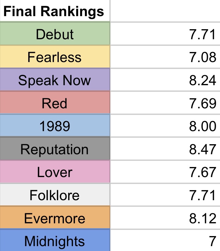 “Then you can look at the score that you gave each album and see how they actually rank for you.” White said. “Doing this is what gave me the embarrassing news that ‘Speak Now’ is actually my favorite album, even though I’ve been saying ‘Red’ is my favorite for 10 years,” she said, jokingly.