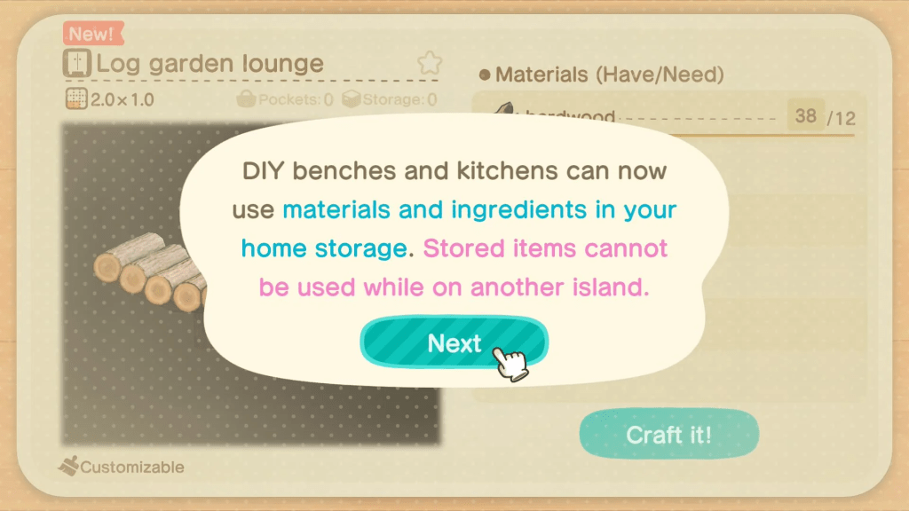 - Storage explodes to 9,000 slots (two upgrades: 7k for 1.5M Bells, then 9k for 1.8M)—store trees, flowers, bushes forever!